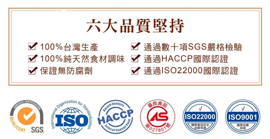 榮獲HACCP、ISO22000國際品質認證、通過SGS食品檢驗合格,打造出好品質、好安心的台灣在地的好味道!