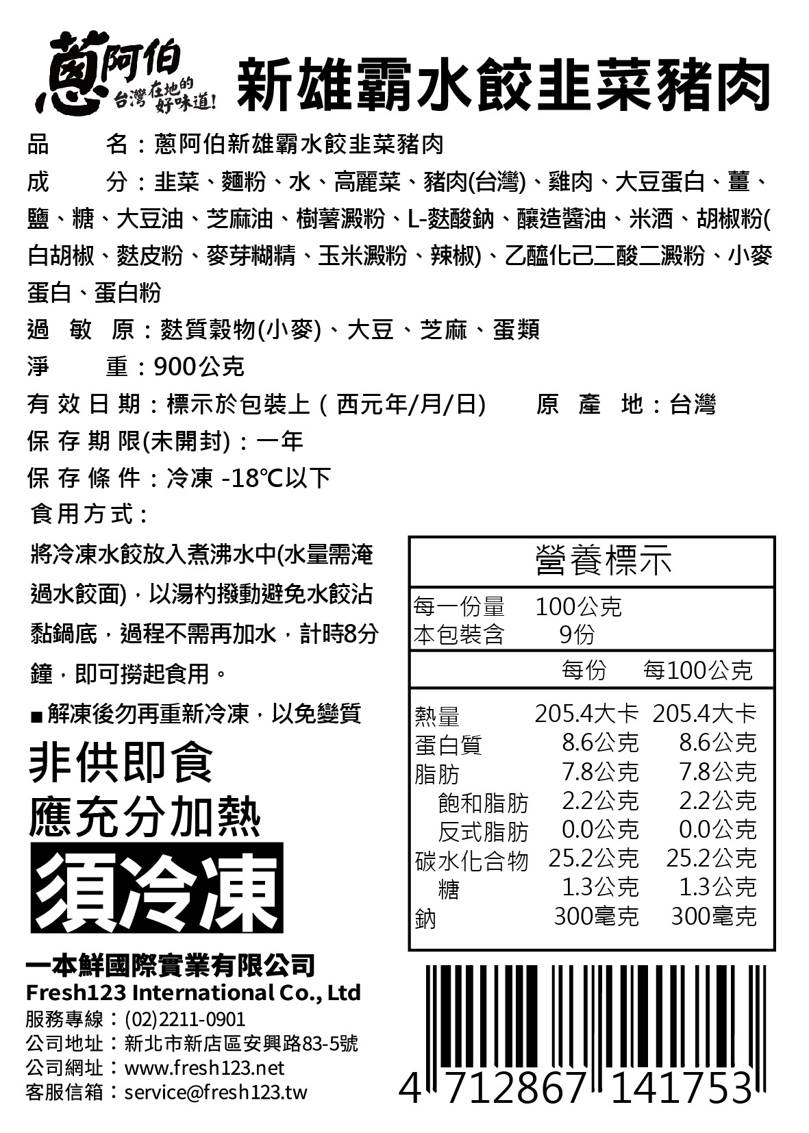 【蔥阿伯】新雄霸水餃 韭菜豬肉 900g( 約50粒 )